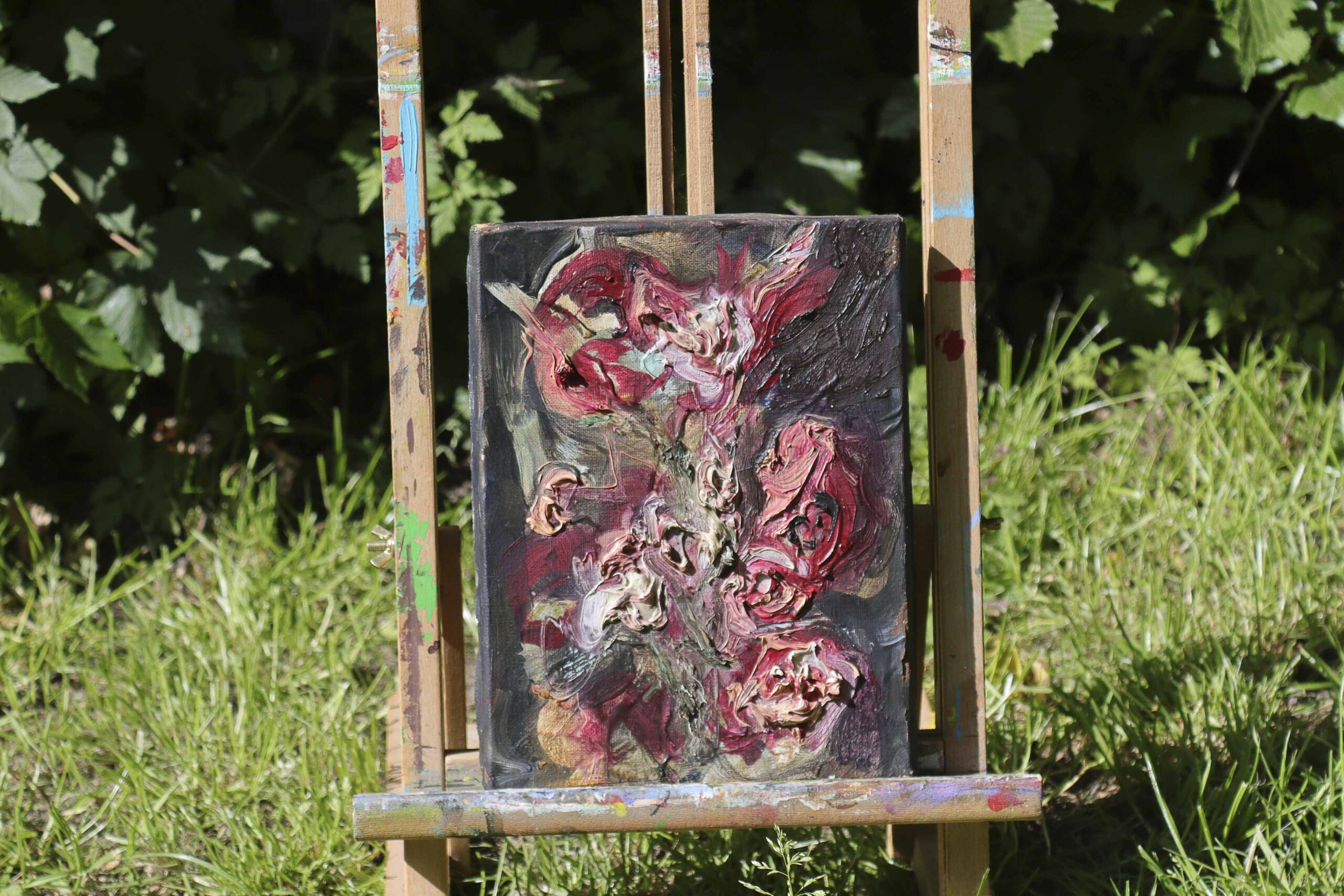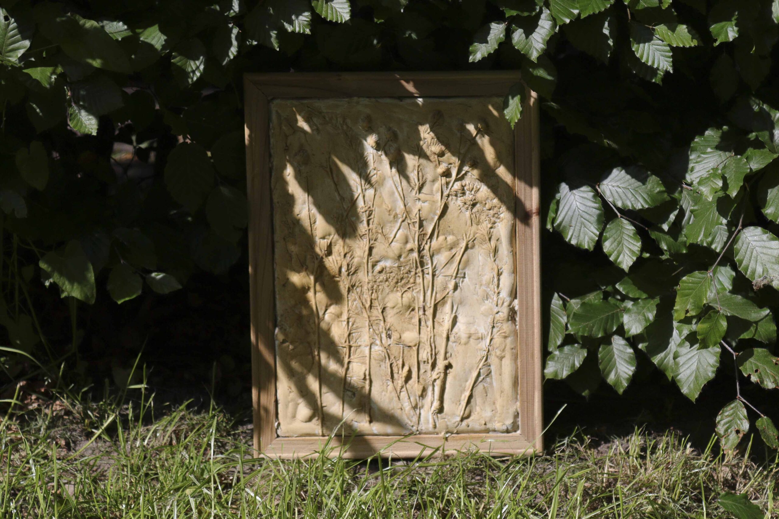 Mixed media op een drager van een zelfgemaakt houten paneel april/mei 2019.