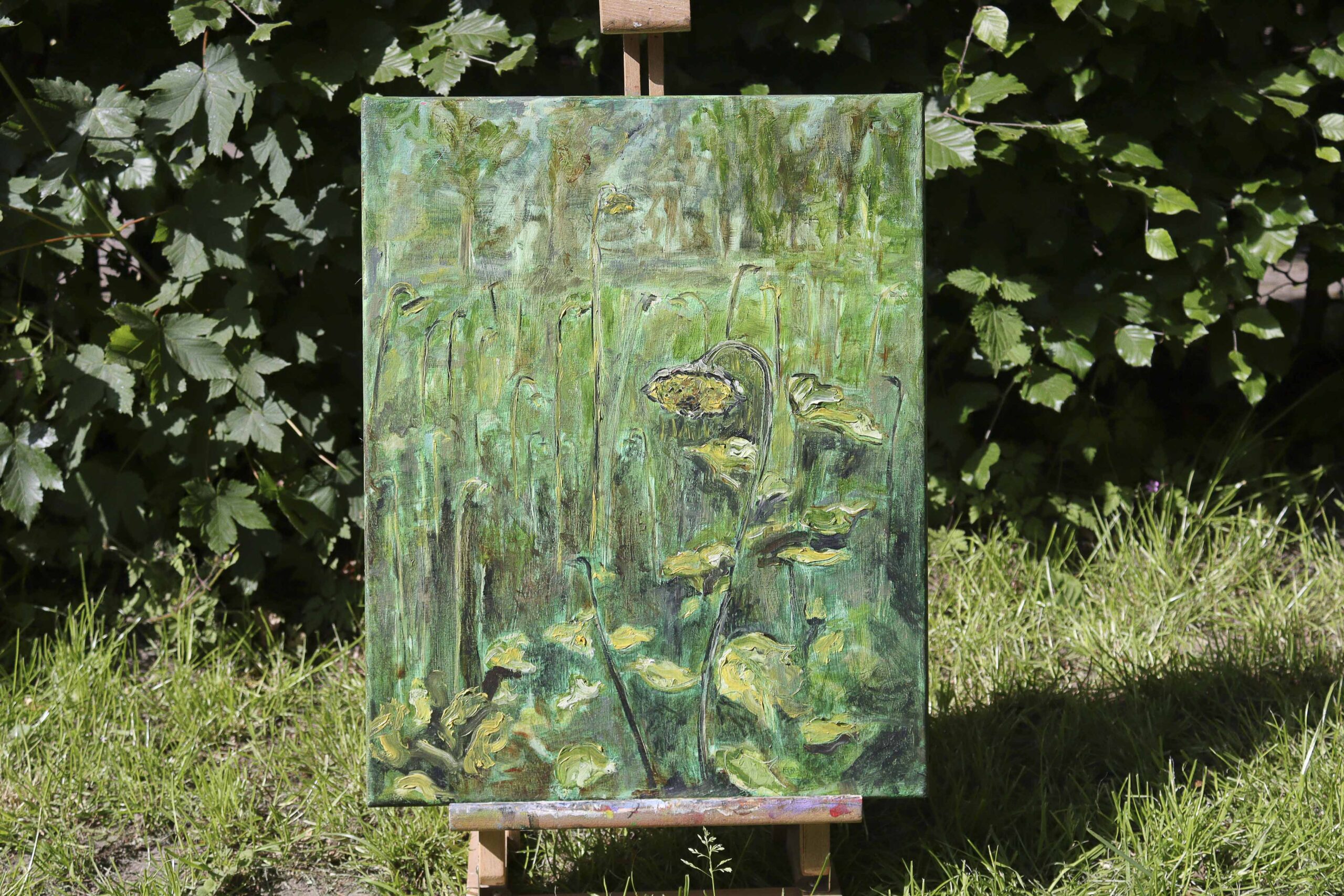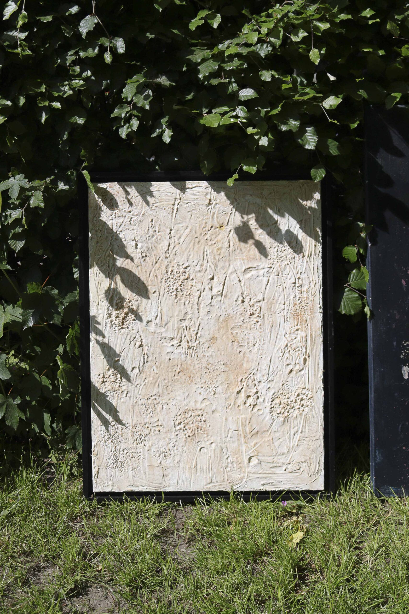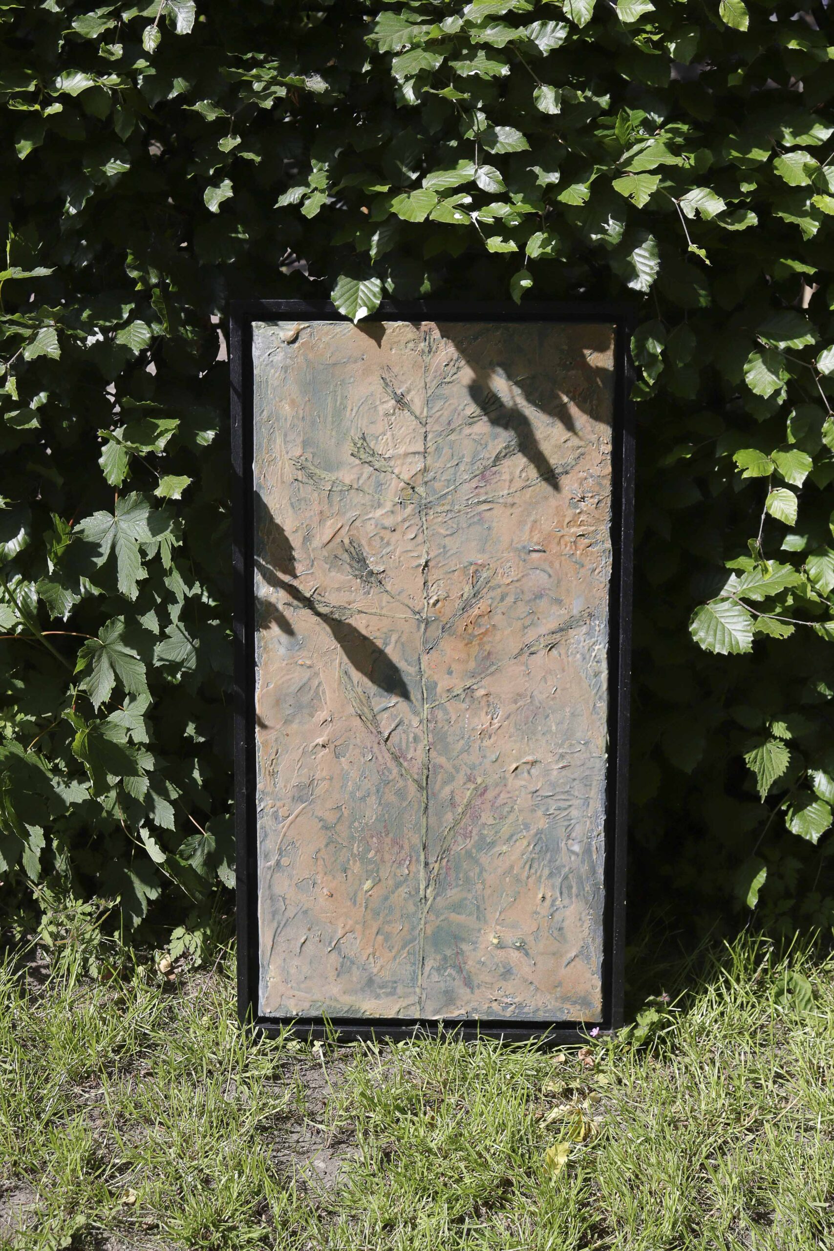 Mixed media op een drager van een zelfgemaakt houten paneel 1,50 / 1m, april/mei 2019.